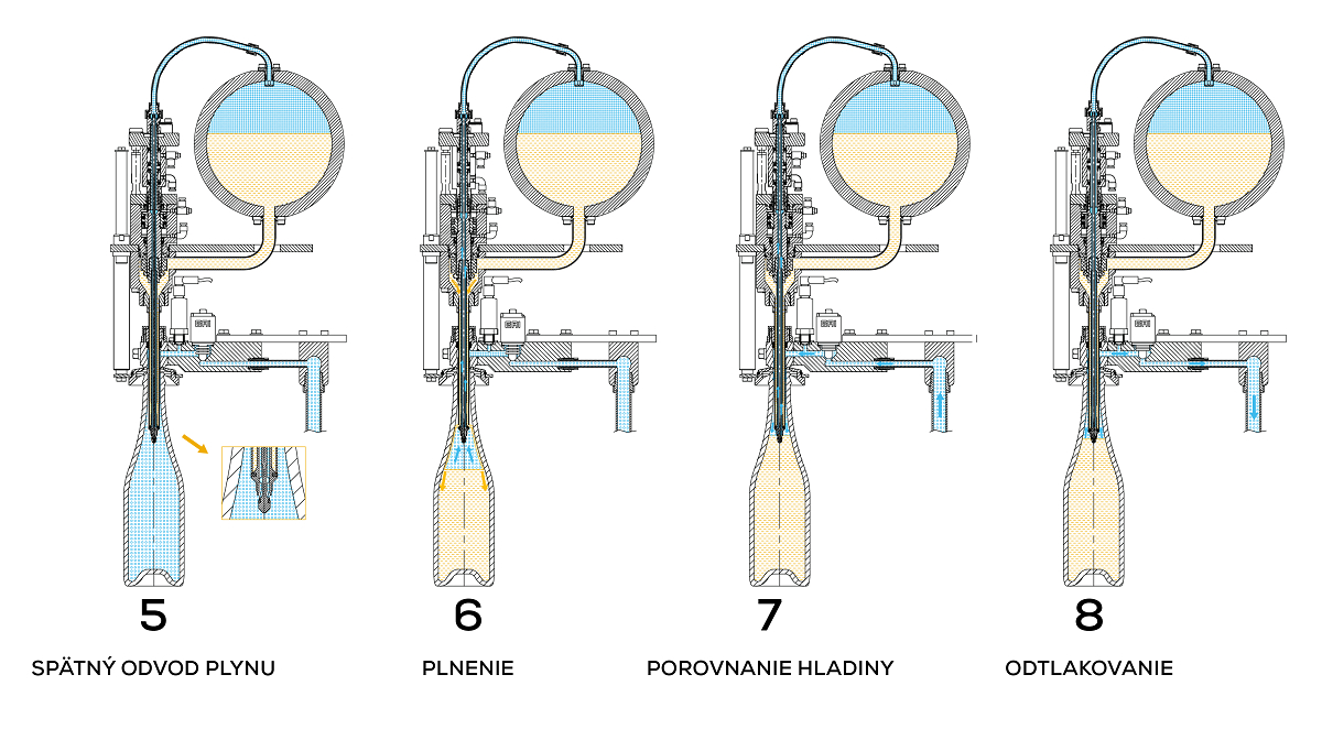 Nastavenie plniaceho cyklu vrátane načasovanie jednotlivých fáz je možné prispôsobiť podľa typu plneného produktu, čo zaručuje maximálnu presnosť opakovania lahvovacího procesu. Tým sú dosiahnuté najlepšie výsledky plnenia.